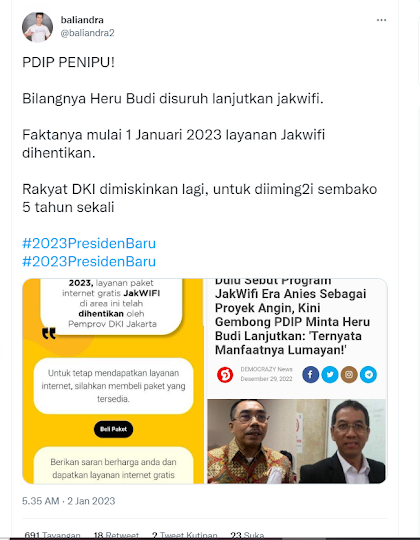 Hal ini ditanggapi oleh seorang warganet dengan akun Twitter @baliandra2, yang menilai bahwa PDIP penipu, karena Heru Budi menghentikan JakWIFI.