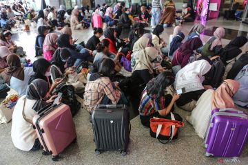 Pengunjung duduk di lantai saat menunggu dibukanya Pameran Jakarta x Beauty 2023 di Jakarta Convention Center, Jakarta, Minggu (17/12/2023). Pameran produk kecantikan yang diikuti lebih dari 300 brand lokal maupun internasional tersebut bertujuan untuk memenuhi kebutuhan produk kecantikan dan memberikan kontribusi bagi perekonomian negara. ANTARA FOTO/Asprilla Dwi Adha/foc.