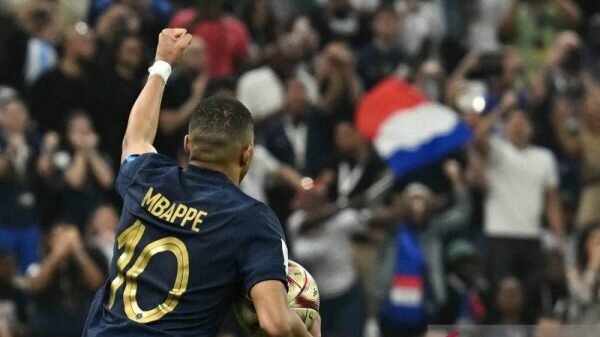 Pemain timnas Prancis Kylian Mbappe berselebrasi usai mencetak gol ke gawang Argentina pada pertandingan Final Piala Dunia Qatar 2022 di Stadion Lusail, Lusai, Qatar,...